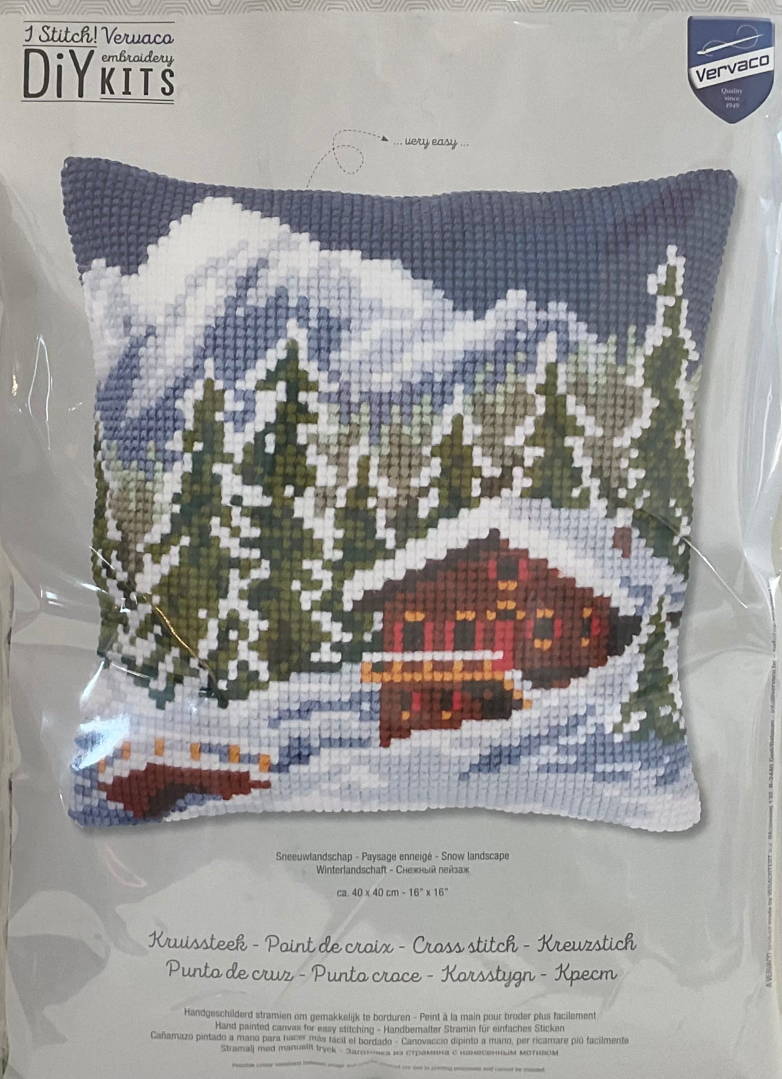 5 Mesh. Design Area: 16" x 16". Includes hand painted canvas, all threads, needle and instructions.